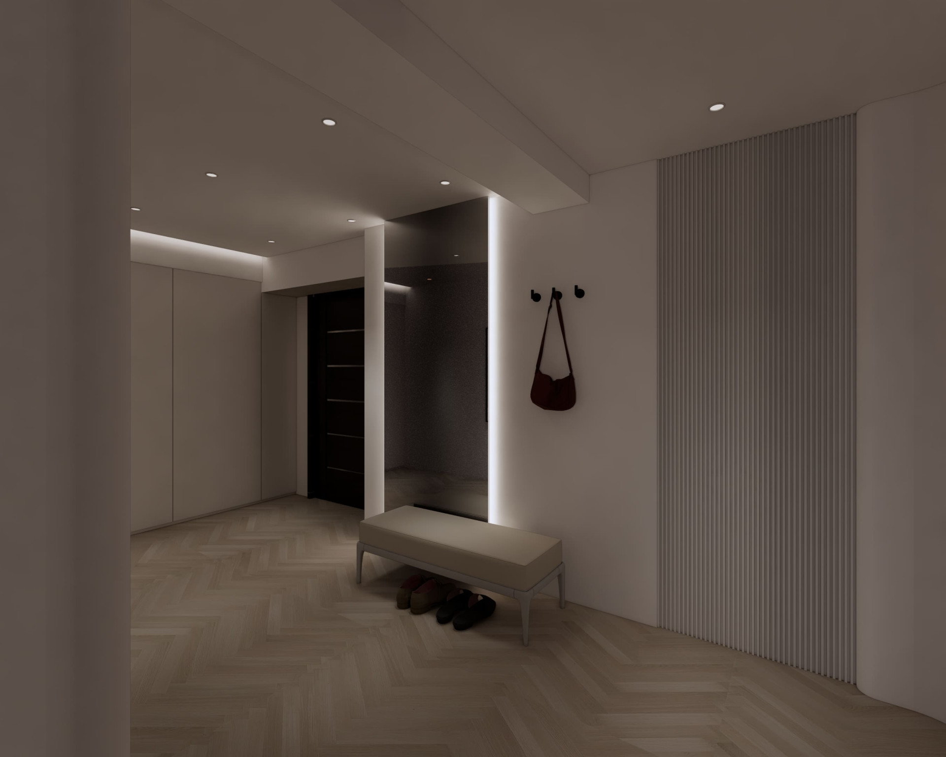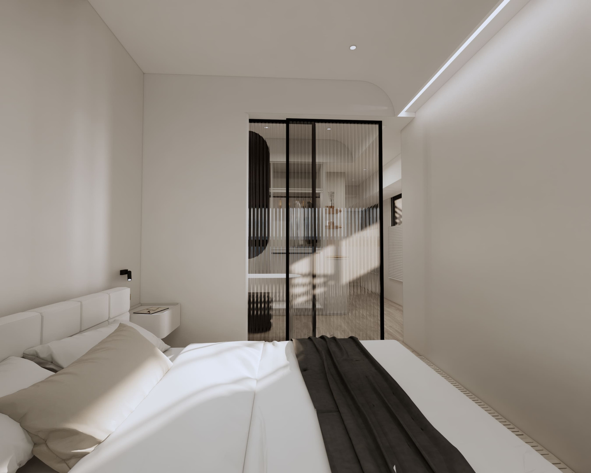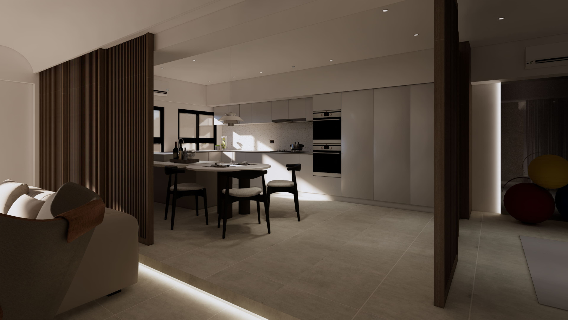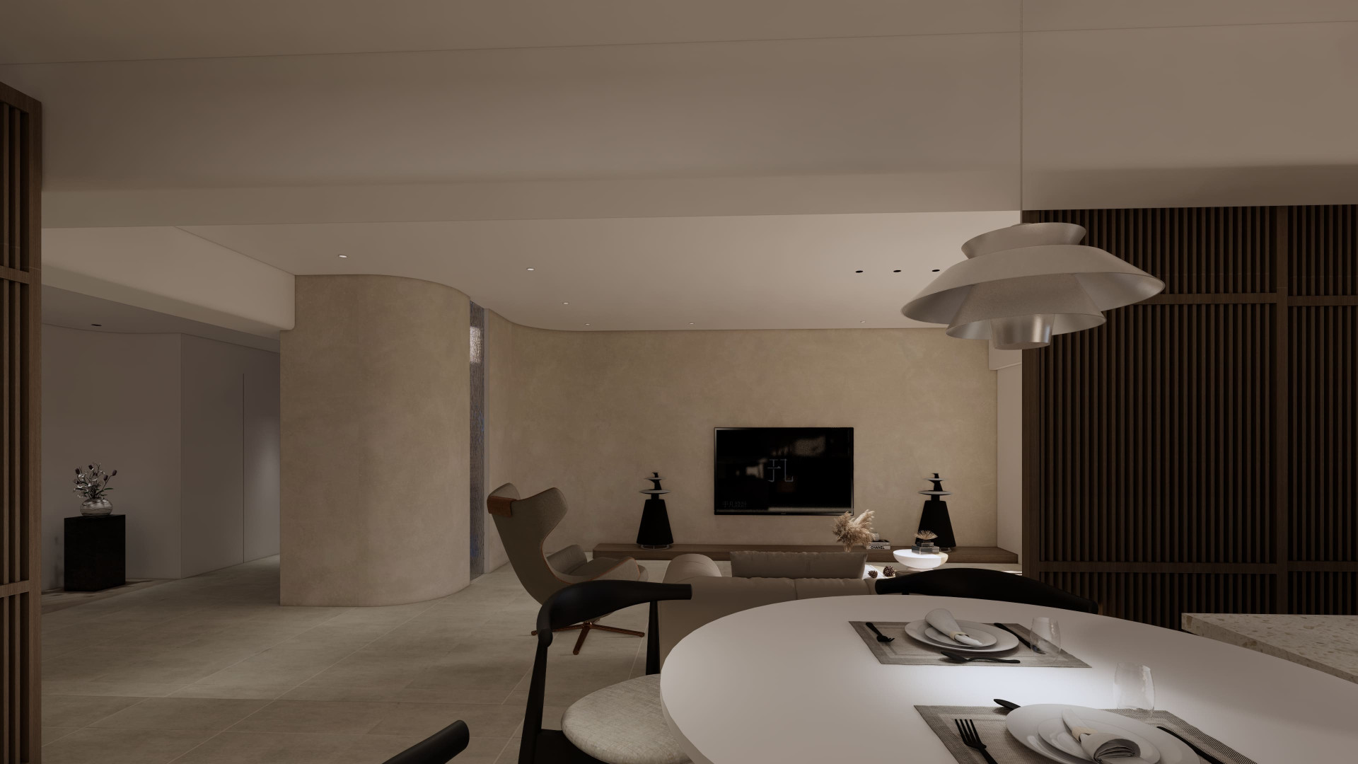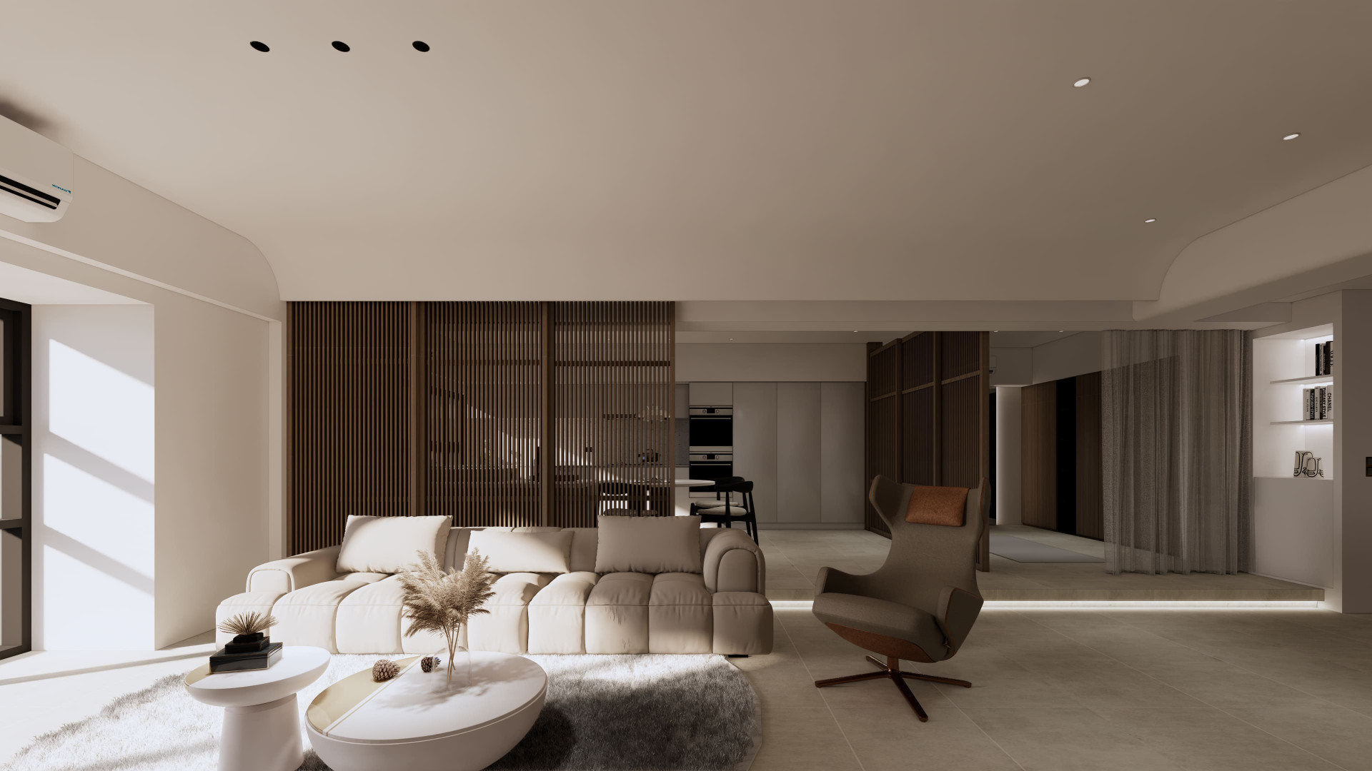 市政愛敦閣 以「溫潤與留白」為空間主軸。 透過木質格柵創造半開放式場域在客廳與餐廚之間建立視覺層次 柔和的奶油色調搭配隱藏式燈光與低飽和材質讓空間在簡約之中保有溫度與深度。 讓生活,在安靜的設計裡慢慢展開。